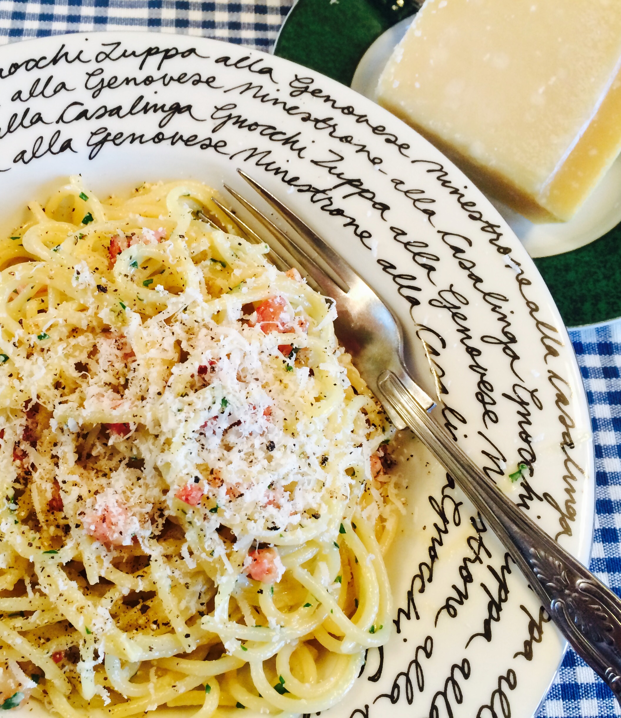 Once spaghetti is cooked al dente, drain thoroughly and return to the pan. In a bowl, beat eggs and mix with most of the cheese – saving some for garnish – parsley and some pepper. Pour this into the pan with the spaghetti, add the pancetta too, and toss over a low heat. It is essential to toss rather than stir, without a vertical motion you are guaranteed to end up with some scrambled egg floating around, spoiling it for everybody.